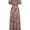 Floral print, sweetheart v-neck, bubble short sleeves, high waist, ruffle hem, A-line and ankle length design; Casual dress with sleeves; Elegant dresses for women, highlighting feminine charm