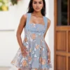 Women Sleeveless Mini Dress Summer Floral Embroidery Square Neck A Line Dress for Vacation Cocktail Streetwear