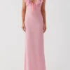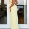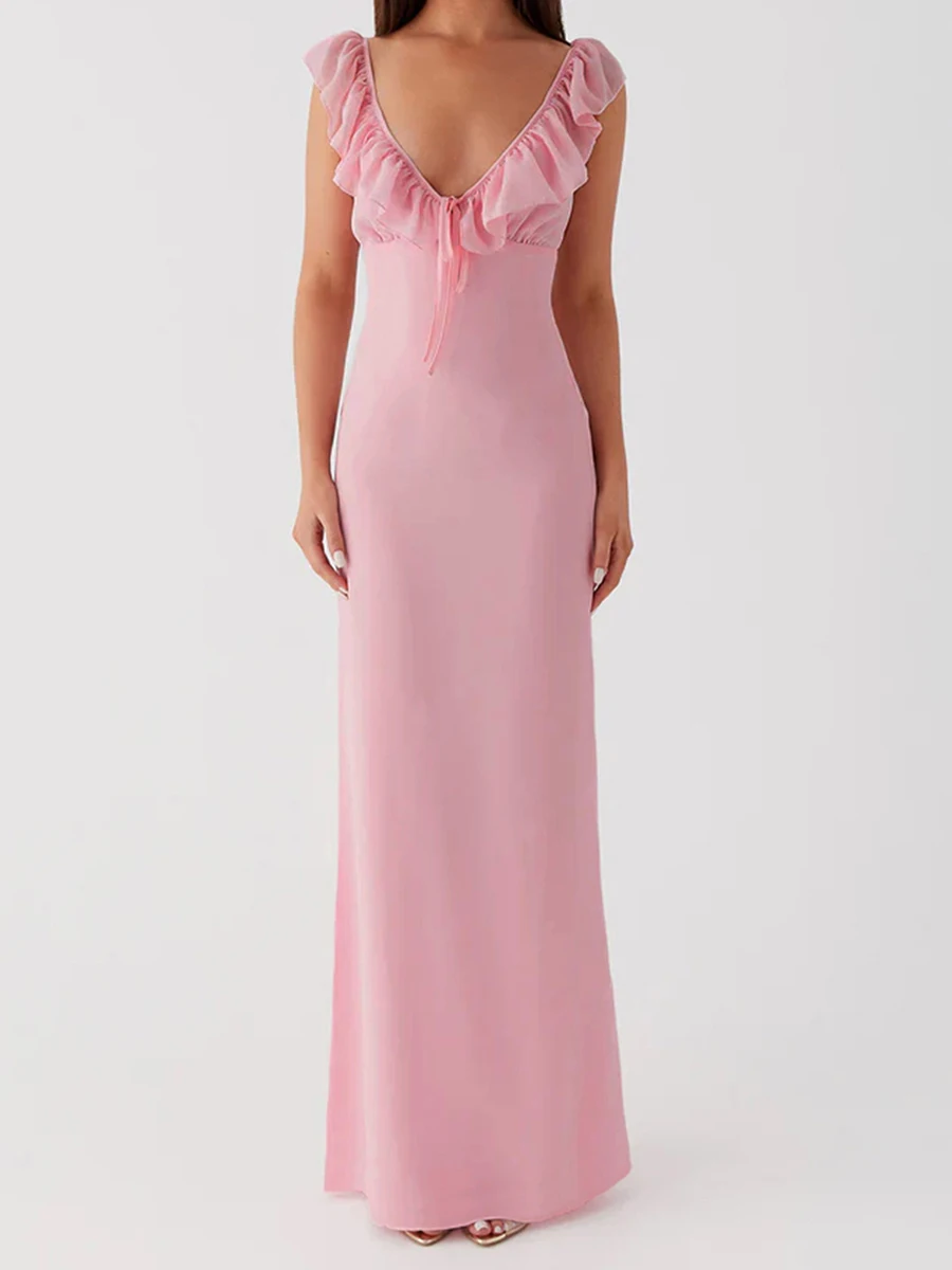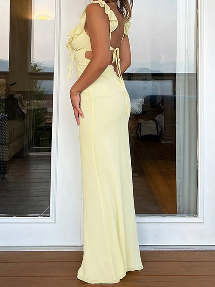 Women Ruffle Trim Cami Dress Slim Solid Color Deep V Neck Open Back Tie Long Evening Dress for Party Club
