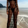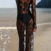 Womens See-Through Lace Dress, Long Sleeve Round Neck Slit Hem Dress Chemise Beach Vacation Party Wear